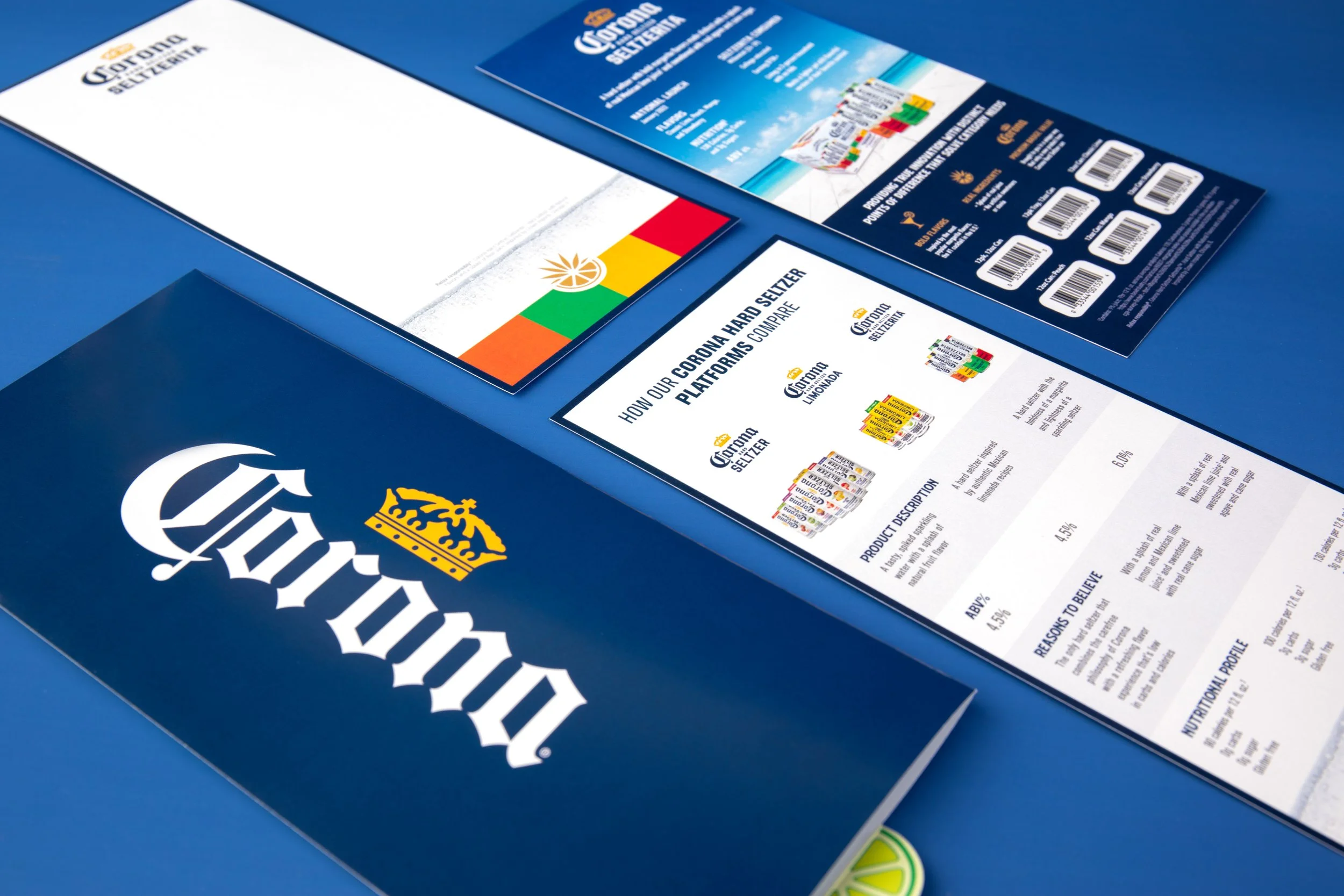 Vine Creative Studios has worked on dozens of sell-in kits for Constellation Brands’ ever-growing portfolio of Brands. Here, a specific product line-extension to Corona, Seltzerita cans deserved a special sell-in kit that would not only excite Sales Teams and Distributors, but educate them on the new product. Inspired by high-end, premium tequila boxes, this one was incredibly fun to work on because it went beyond the typical 2D folder kits into the 3D space. Interactive and dynamic, the box lid comes off and reveals a four sided box housing each can flavor on a different side. The kit is completed with a special pocket where a folder peaks out including stationary, product details, and a chart of Corona Seltzer’s complete portfolio of products. The bold, bright flavor-cue colors and blind-embossed Corona logo topped with a special gloss demands special attention to this piece. Special thanks to the Team at Vine Creative Studios and Hawver Display for helping me create and construct this special one.